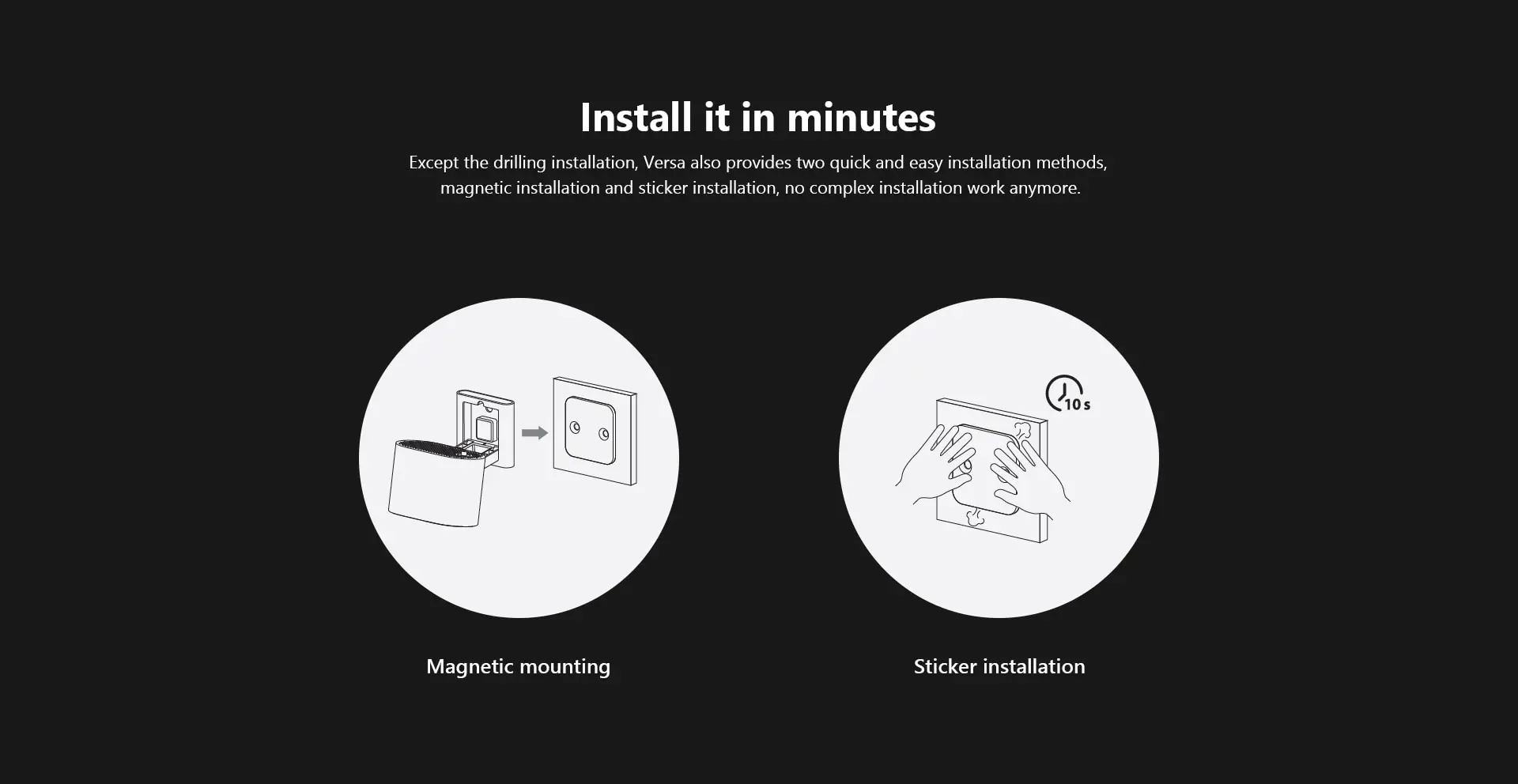 Exceto a instalação de perfuração, Versa também fornece dois métodos de instalação rápida e fácil, instalação magnética e instalação de adesivos, sem mais trabalho de instalação complexo.